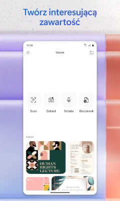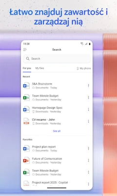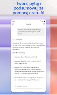 Twórz zachwycające materiały wizualne – obrazy, plakaty, banery, filmy, ankiety – korzystając z prostych szablonów, które pozwalają na ekspresowe przygotowanie dopracowanych treści. Zeskanuj dokumenty, zdjęcia czy odręczne notatki bezpośrednio z urządzenia mobilnego, a następnie łatwo nimi zarządzaj. Dzięki funkcji Notatki Copilot bez trudu zbierzesz pomysły, dokumenty i linki, a asystent podsumuje i połączy wszystko w spójną całość. Przesyłaj pliki Word, Excel czy PDF z pamięci telefonu, aby Copilot mógł Ci pomóc, a następnie swobodnie zapisuj efekty jego pracy z powrotem na urządzeniu. Wszystkie te możliwości, wraz z dostępem do edycji dokumentów Word, Excel, PowerPoint i PDF, są dostępne w jednej, kompleksowej aplikacji od Microsoft, umożliwiając produktywną pracę w podróży.
